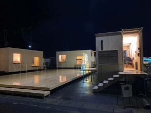 あのアウトドアメーカー「スノーピークス」社製でデザインは隈研吾氏という、すごい建物。