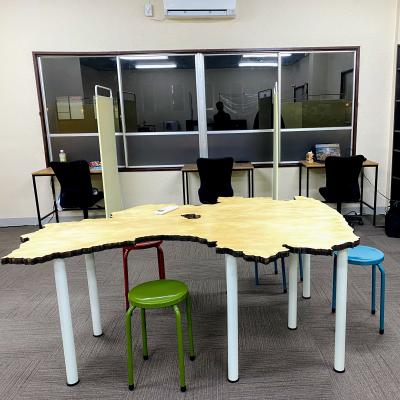 福島県をかたどったテーブルが真ん中に。個別のデスクがあり、会員は24時間入退室が可能。夜遅くや早朝の仕事でも対応できるのが、うれしいところです。