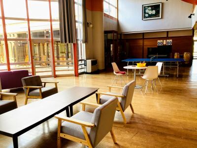 【ロビーに卓球台。いかにも学校という「音楽机」がワクワクします】