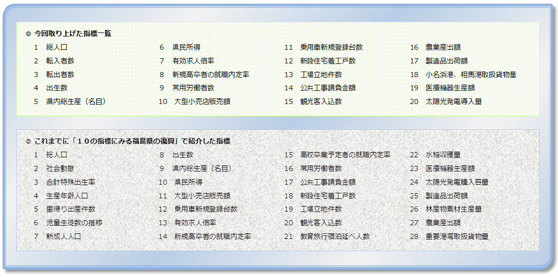 統計課では、本県の復興への取り組みの成果が各種統計データに表れてきていることを契機に、このことを広く県民の皆さまにご理解いただくため、平成26年6月より、「10の指標にみる福島県の復興」と題して、復興に関係する各指標の震災前後における推移と特徴及び要因等について、定期的に情報発信を行ってきた。