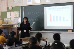 ![]() | 〇郡山市立柴宮小学校 6年生3クラスで授業を実施しました。 穴埋め形式のテキストを使って、前半はアンケートや天気予報など身近なものを例に「統計とはなにか」と「統計の大切さ」について学びました。 後半は最新の統計データを使いながら、福島県の土地や人口などいろいろなことを紹介しました。 |