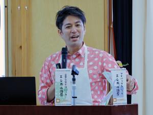 泉崎村出身の料理家・本田よう一さんを講師としてお招きし、エシカル給食会に先立ち行われた出前講座では、小野中学校の1年生約80名が参加し、「地産地消」や「食品ロス削減」などをテーマに、1年生の皆さんと活発な意見交換を交わしながら、「エシカル消費」を学びました。