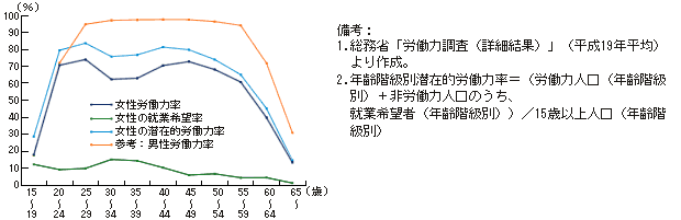 女性の労働力率は、学校卒業後20歳代でピークを迎え、その後の子育て期に下降し、40歳代で第二のピークを迎えるという傾向が見られる。その形がアルファベットのMの文字に似ていることからM字型曲線と呼ばれている。これに就業希望率を加えた潜在的労働力率を見ると、M字のくぼみは小さくなり、就業希望はあるものの実現していないことが分かる。M字型曲線は、日本や韓国などに独特なもので、保育施設の進んでいる北欧諸国などでは、出産・育児期の落ち込みはみられず、男性同様、台形のカーブを描いている。