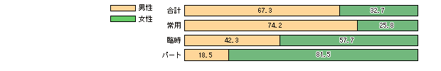 雇用形態別の男女の割合をみると男性の方が割合が高いのは、「常用」(74.2%)で、反対に女性の割合が高いのは「パート」(81.5%)であった。