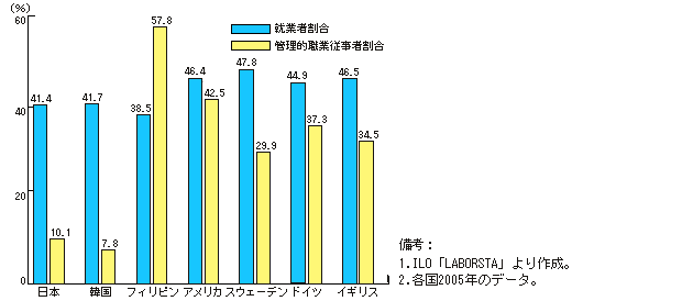 | (りくお) | 日本では、働いている人の4割を女性が占めているのに、管理的職業従業者に占める割合は欧米諸国と比べても極端に低いよね。 |