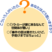 | ○被害者を救うために 私たちは誰でも犯罪・事故の被害者になる可能性があります。しかし突然やってくる犯罪や事故は防ぐことができないため、大きなショックを受けてしまいます。また、直接の被害だけではなく、捜査や裁判への対応も大きな負担となり、被害者は大変辛い思いをしています。このような時に被害者を責めたり、興味本位で事件のことを訊いたりすれば、事件そのもの以上に被害者は傷ついてしまいます。やり場のない苦痛や悲しみ・悩みをどこにも向けられない被害者には「心のケア」が必要です。被害者の思いに共感し、手助けをすることが、一番の励ましになります。次に助けてもらうのは、あなたかも知れないのです。 | ![]() |