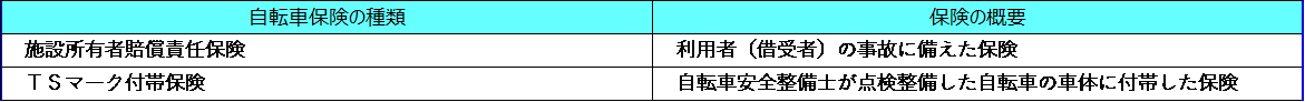 ・そのため、利用者(借受者)の運転ミスを含め、貸し出した自転車の利用全般を補償する保険への加入は保険会社などに相談してください(商品・引受は保険会社ごとに異なります。補償の条件や補償範囲等の詳しい内容は、保険会社にお問い合わせください。)。