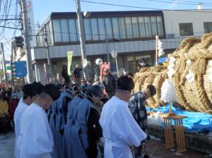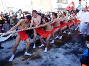 1月14日、高さ2・5メートル、長さ4メートル、 重さ5tもある大俵を引きあうために、100人以上の参加者が福島県会津坂下町に集まった。