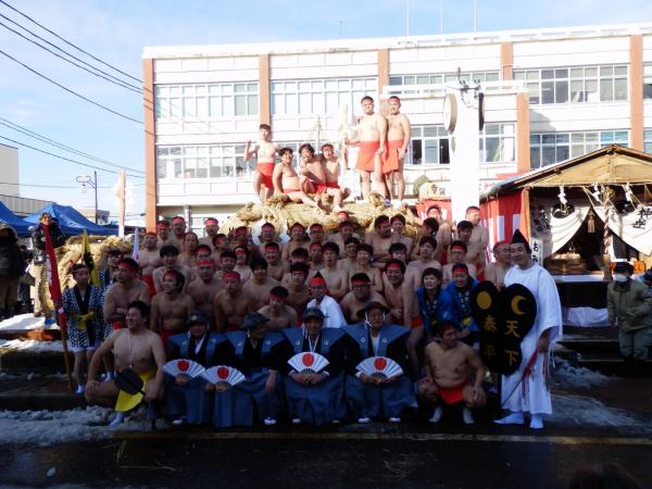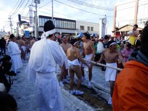 参加者に怪我がないように祈り、お祓いが無事終わり、参加者が東組と西組にわかれ、それぞれ赤と白の下帯一本の姿で会場に駆け付けた。