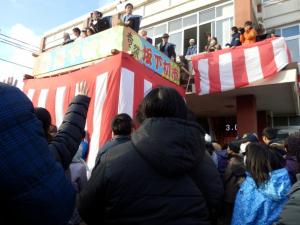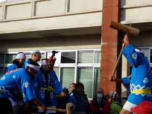 大俵引きが終わり、役場前で餅つき、鏡割り、福豆俵まきなどさまざまな催しが行われた。