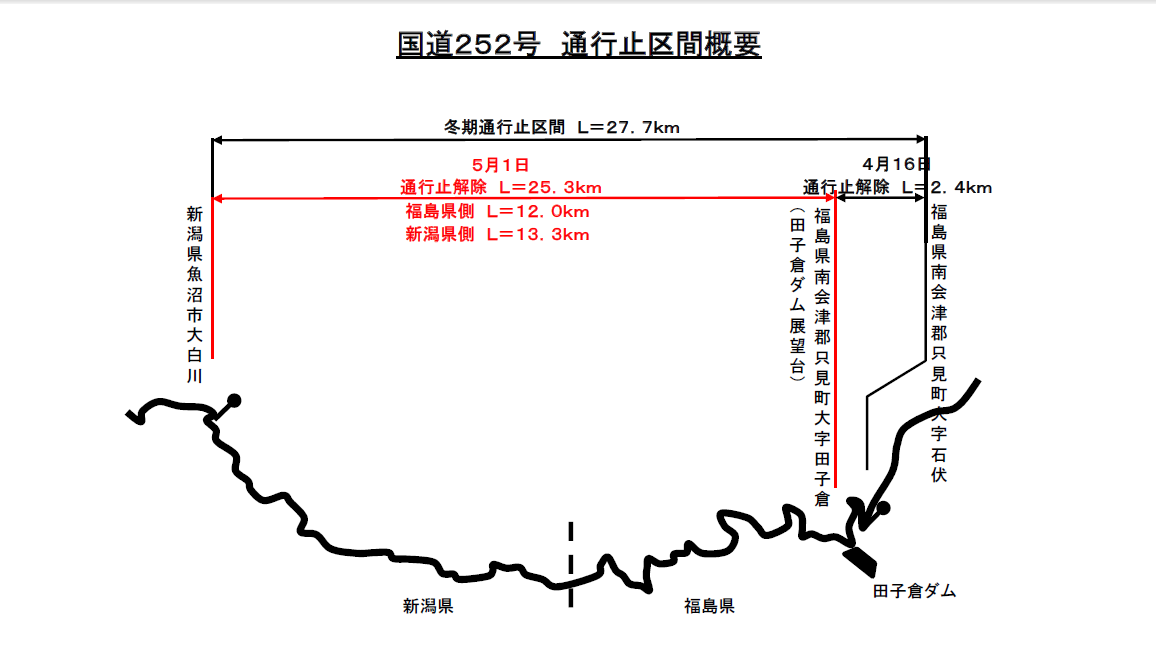 長い冬を経って、5月1日にようやく区間再開通を果たした「六十里越」に行ってみました。