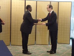 (左写真:知事より認証書授与されるムエンベ博士、右写真:オマスワ博士)