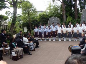 入り口から町長、議長、記念館理事長、館長、子どもたちによる歓迎のお出迎え、生家前ではセレモニーを開催いただき、地元の中学生による合唱が披露されました。
