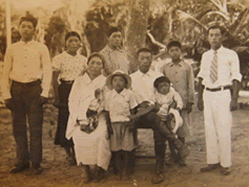 移住当初の末永家。中央に座っている父親の手に抱かれているのが、当時2歳の友子さん。右端は叔父。後ろに見えるバナナの葉や熱帯系の植物が、入植地の様子を物語る。下の写真は、会津弁のやさしい語り口調が残る、現在の友子さん。