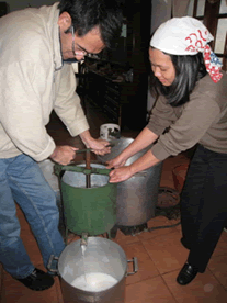 おからと豆乳とに分ける作業風景。写真中央の「しぼり機」は日系人の仲間からゆずり受けたものだ。大豆をミキサーにかける以外は、すべて手作業。大豆5キロ分で、作業開始から、できあがりまで約3時間。