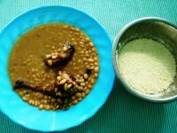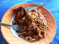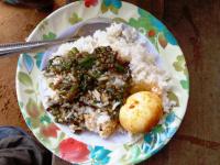 豆もよく食べられます。これはクリスマスにいただいた食事です。バンズゥーという煮豆に鶏肉が入っています。上にガリと呼ばれる白い粉をかけて食べます。ガリはキャッサバという芋から作られます。ご飯にもかけますし、ガリを水に溶いたものをパンと一緒に食べたりもします。