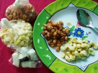 トウモロコシとピーナッツを蒸した、素朴なおやつです。左下の袋に入ったココナツと一緒に食べます。
