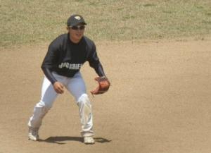 コスタリカナショナル大学の学生たちと。 |  サードを守る加藤隊員。 |  バッターボックスに立つがこの後・・・ |