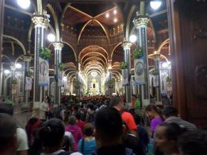 巡礼―ロメリア― さて、ここからは活動とは異なりますが、コスタリカの宗教や文化について少しご紹介します。 コスタリカは国民の多くはキリスト教のカトリック教徒ですが、そのカトリック教徒たちにとって一年の中でも特に大事な日があります。 8月2日になると、およそコスタリカの国民の半分にも上る200万人が、ある教会に集まると言われています。その教会には、キリスト教の創始者であるイエス・キリストの母親のマリアの像が祀ってあり、その像がこれまでたくさんの奇跡を人々にもたらしてきたと信じられてきました。その像が発見されたと考えられているこの日に、多くの人々が歩いて教会まで向かい、家族や愛する人の健康を祈ったり、また幸せであることを神様に感謝します。これを宗教の言葉でいうと巡礼(スペイン語ではロメリア)と言います。遠いところになると一週間やそれ以上もかけて教会を目指す人もいますが、車やバスを使わずに歩くことには、その長い道のりを通じて苦しい思いをしている人々の心情を感じ、体感するという意味が込められています。 今年は、その巡礼に自分も参加しました。多くの人は前日の8月1日の夜に着くように計画して歩き始め、そして8月2日の朝にあるミサ(お祈りの儀式のようなもの)に参加します。自分は前日1日の午後4時くらいから、ちょうど目的の教会から20kmほど離れた場所から歩き始め、夜10時30分に到着しました。 興味深いのは、ただ暗い道をもくもく歩くのだろうと思っていた予想とは裏腹に、教会まで通じるメインの通り沿いには、食べ物や飲み物の屋台がずらりと並び、所々にはミニコンサートのようにステージで歌っている人、さらには無料のマッサージサービスなどもありました。 どこまでも続く道と途切れらない人の波。初めての巡礼はなんだか小さい頃の遠足のようなそんな楽しい道のりでした。 |