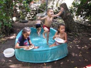 コスタリカのパーティは屋外が基本。 |  子どもたちはプール。 |  家族大集合。 |