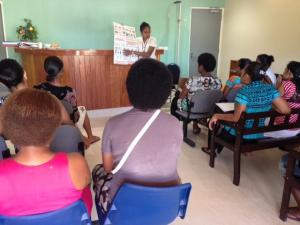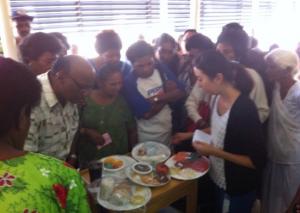 病院の紹介と院内活動 シンガトカ病院は、内科、理学療法科、小児科、産婦人科、眼科、歯科などを有する病床74床の、地区では唯一の国立病院です。フィジーは専門医が少ないため、ドクターは様々な症状の患者を診ています。 管轄内の人口は52,730人で、病院から遠い村のために、さらに5か所の地域に分けて、ヘルスセンター(小さなクリニック)を設置して対応しています。今年から最寄にあったヘルスセンターが、病院敷地内に移動し、協力して仕事をしています。 栄養士は現在、病院担当が1名、公衆栄養(地域)担当が1名います。 病院内の活動は主に下記の3つです。 (1)給食食材の発注や管理、調理室の物品管理 同僚が忙しい時は代わりに給食食材の発注しています。患者への食事は無料提供(国民の税金使用)で、予算が限られているため、無駄を削減するように取り組み中です。 (2)調理員への衛生管理、治療食などのアドバイス 日々の調理員とのコミュニケーションは、信頼関係を築くために欠かせません。病院給食の大切さについてより知識を深めてもらうため、先月からは月1で調理員へのワークショップを開始しました。 (3)入院患者さん、外来患者さんに対しての栄養指導 主に糖尿病や高血圧症などの生活習慣病の患者に食事や栄養のアドバイスをしています。 その他、低栄養児や妊婦の貧血、飲み込みに問題があるお年寄りなどにアドバイスします。言葉や文化は異なり、治療方法や栄養補助食品は、日本のように豊富ではありません。限られた状況でできることを探しながら活動しています。 |  妊婦への貧血予防の集団教室