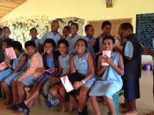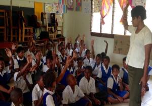 院外活動 病院外の活動は、主に公衆栄養担当の栄養士が行っています。広範囲に渡るため、人手不足の際は、病院担当の栄養士と協力して活動します。 (1)ヘルスセンターに小児定期健診に来る母親への栄養指導 2歳までは、1ヶ月1回の体重、身長測定の他、定期的なワクチン接種や母親へのアドバイスをヘルスセンターで行っています。その際に離乳食指導や、下痢や食欲不振で低体重が続く小児の家族に、栄養や衛生に関するアドバイスを栄養士が行っています。 (2)学校巡回指導 例年2~7月に、看護師、歯科医、栄養士などの職員でスクールチームが編成され、管轄内の学校50校以上を巡回して、児童と教師に健康診断をしています。栄養士は、身長、体重から栄養状態を判断して、問題のある生徒へのアドバイス、授業スタイルで食事や栄養に関する講話、学校内の食品販売店の調査(ジャンクフードの有無など)、校内菜園の確認をしています。保健室や給食制度がある日本と異なるため、学校巡回はとても貴重な機会となります。 (3)村や職域への健康診断とアドバイス 健康診断のリクエストやイベントがあると、村や職域に出張しています。シンガトカはリゾートが近く、学校巡回とほぼ同じ時期にリゾートホテルの従業員に対して行うことがあり、一番多忙な時期です。 その他、女性グループやコミュニティヘルスプロモーターへの栄養や食事の講義を行ったりしています。日本での経験や勉強を生かして、役に立つ情報、技術を共有していければと思います。 |  児童への食事と栄養の講義の様子 |