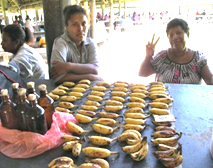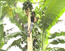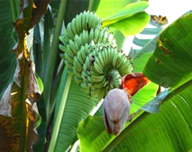 日本で食べるバナナの他にも、実が赤いバナナ、太くて短いバナナ、煮込んで食べるクッキングバナナ、などがあります。基本的に一年に一回の収穫で、収穫後はそのバナナの木を根元から切ります。すると幹の中央部分よりすぐに新しい芽が出てきて、来年も収穫することが出来ます。収穫後に切らないと、その木が倒れてしまいます。 |
