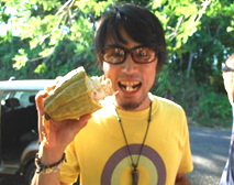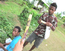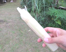 | 手首ほど太くなったサトウキビ、硬く分厚い皮をナイフで剥いで中の白い部分を噛みます。味は思ってたより甘くなく、梨(豊水)のような爽やかな甘さが口いっぱいに広がります。噛むだけで、水分が無くなったら捨てます。30cmほど噛めばもうお腹いっぱいになってしまいます。 |