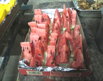 | 日本で食べているスイカと同じです。果肉が赤いものや黄色いものもあります。形も丸いものだけでなく、ヒョウタンのように細長いものもあります。一つ500円~1000円前後で、高価なフルーツになります。