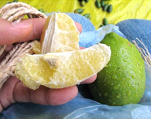見た目はライム、レモンのような形で、果肉はグレープフルーツの粒が小さく硬い感じ。味は不思議な味で、薄いオレンジのよう。一つ20円前後で売られています。醤油を付けて食べると、とびっこ、数の子、のようでした。