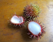 | 赤いトゲトゲの柔らかい皮の中には、ライチに似たような食感と味で、おいしい。1年に一回、食べられるかどうかという、とても珍しいフルーツです。 |
