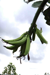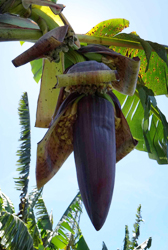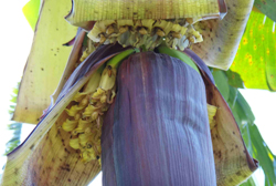 ところで、この国の人々はのんびりしています。昼間の炎天下が嫌いなので、午後は建物の影に隠れて過ごしています。農作業のような仕事は、午前中で切り上げるのが普通のようです。熱帯気候のおかげで、あまり世話をしなくてもバナナやさつまいもが年中とれてしまうので、のんびりしていても楽しく過ごせるのです。 ときたま、そののんびりした人々と働く歩調が合わなくなるのですが、見たこともない植物、昆虫、魚、動物との出会いに感動しながら、楽しく過ごしています。これから2年間過ごすわけですが、そうした動植物の見せる姿を見ていたらあっという間に2年はすぎてしまうように思います。これから、5回ほどですが、そうした日本にはいない動植物の姿を伝えていこうと思います。今回はこの国の人の主食バナナについて。 日本では、バナナというとフィリピン産の黄色いバナナが普通ですが、ここには調理用と生食用があります。ここに来るまで、バナナの花を見たこともなく、調理して食べたこともありませんでした。バナナは、大きな紫色のつぼみの中に、ふさになって入っています。日がたつと、茶色のつぼみの皮が剥がれおち、黄色っぽい花が咲きます(写真1)。日本で食べるバナナの一本一本のヘタの部分には花が咲いていたのです。花は良い香りがするようで、ミツバチやアブがたくさんやってきて、蜜を吸い、受粉を手伝っていきます。 |