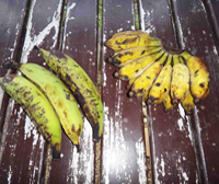 受粉を終えると、つぼみの皮が落ち、花も落ちて、みるみるうちに大きくなっていきます。最初は黄緑色(写真2)ですが、だんだん深い緑色になり収穫されます。種類(写真3)によって大きさや熟して黄色くなるまでの時間が違うようで、調理用で売られているバナナも黄色く柔らかくなると甘くおいしいバナナに変わります。調理用は煮るか揚げるかして食べるのですが、味はジャガイモそっくりです。1本食べたら満腹になれます。私は豆を煮て作ったカレーにゆでたバナナをそえて食べています(写真4)。ゆでバナナにバターをかけるとじゃがバターそっくりです。黄色いバナナも日本で食べるのとは違ってすごくおいしいです。 バナナの木は一度バナナがなると枯れてしまうので切り倒します。すると下から新しい芽が出てきます。ここの人たちは、植え替えながらバナナを増やしていきます(写真5)。バナナはニューギニア島が原産らしく、たまに大きな種のあるバナナがでてきますが、普通は種は小さく、植えても芽はでてこないみたいです。 今回は、日本では見ることのできないバナナの育ち方について書いてみました。日本でバナナを食べるときに、遠い南国の地で花が咲いて実っている光景を想像してみてください。少しだけ南国に行った気になれるかもしれません。次は、夏になるので昆虫の話にしてみたいと思います。