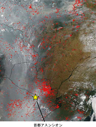 衛星写真で見たパラグアイ周辺の火災地点 火災はパラグアイのみならず、ブラジル・アルゼンチン・ボリビアにまで広がっている