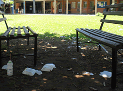 カトリック大学のキャンパスの中の中庭のベンチの周りも必ずしもきれいな時ばかりではない(キャンパス内にゴミ箱はあるのに!)。