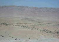 シリア内陸部の砂漠地帯の様子。疎らに雑草が生えているところは冬季の降雨時に水の流れた跡のようである。