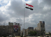 アレッポ市中心街にある広場の様子。シリア国旗の掲揚とアサド現大統領の肖像画が見られる。