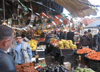 アレッポ市の中心街にある野菜市場の様子。シリアは野菜が豊富で、日本のスーパーで見られる野菜は略揃っている。しかも値段が安く、例えばきゅうりは1キロ60円ぐらいである。