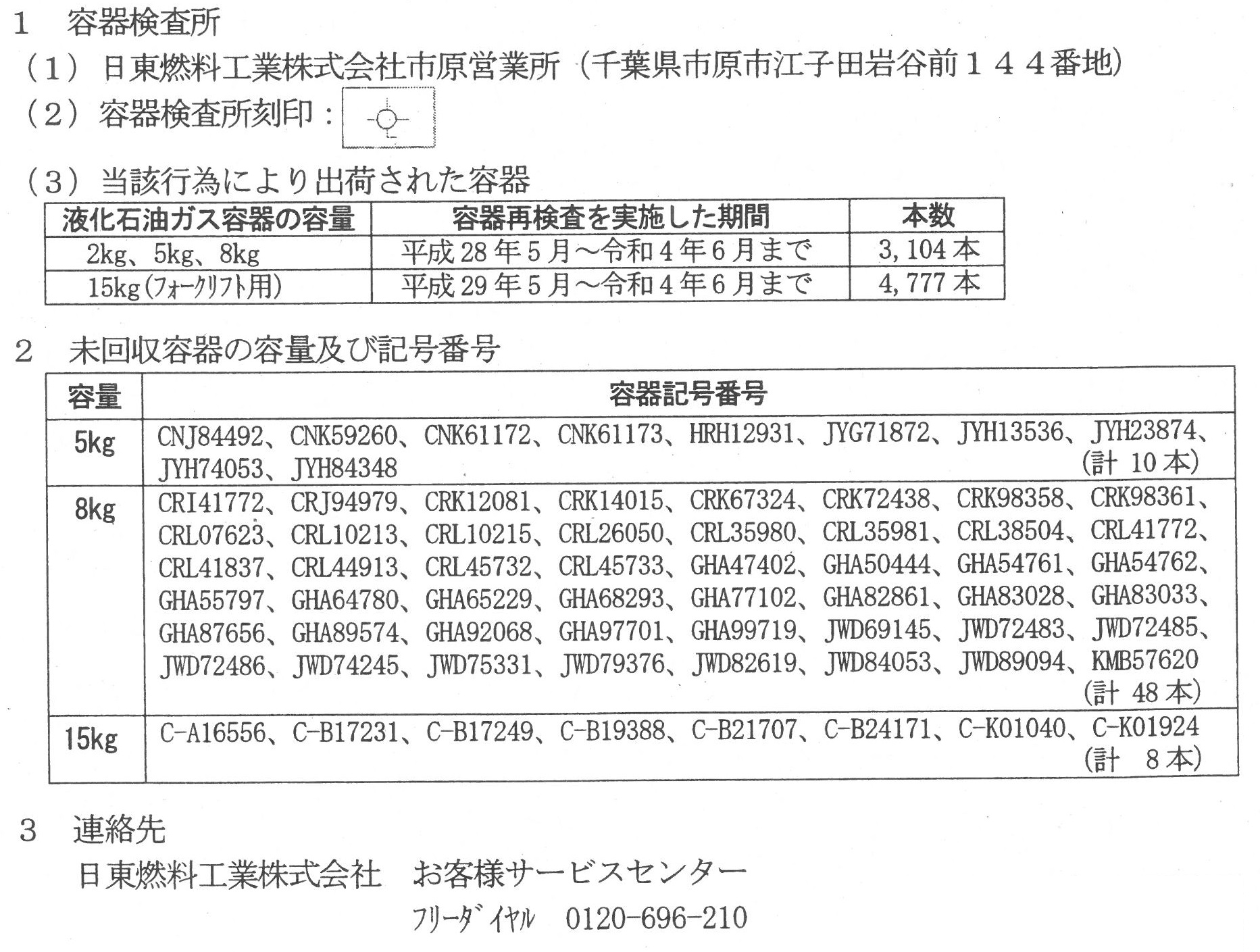 この度、千葉県産業保安課より未だ未回収の容器の一覧についてのお知らせがありました。