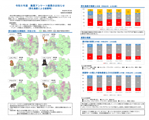 調査結果について、下記のとおりお知らせしますので、ご自身のお住まいの地域の状況をご確認いただき、各獣害対策の参考としてください。