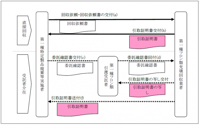 第一種特定製品の廃棄等を行う場合、フロン類を引き渡すにあたっては、フロン排出抑制法に基づき、行程管理制度に従って書面の交付や保存を行う必要があります。