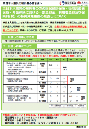 東日本大震災が発生した当時に原子力災害被災地域にお住まいだった方を対象として、国が医療・介護保険料や窓口負担等の減免を行ってまいりましたが、令和5年度から、この減免措置の見直しを開始しています。