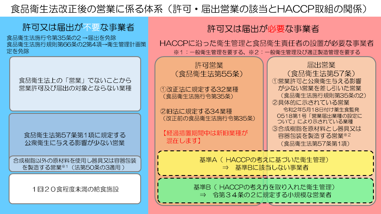 食品営業については、これまでの「許可」を受ける必要のある営業区分(以下「許可営業」という。)に加え、「届出」を要する営業区分(以下「届出営業」という。)が新たに創設されました。また、営業の区分によらず、原則すべての事業者はHACCPに沿った衛生管理が必要となります。