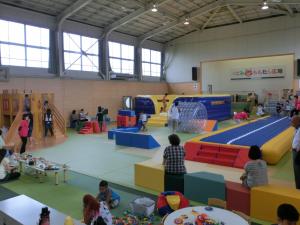 体を動かす遊びのスペースには、空気の力を利用した遊具、跳んだり、跳ねたりできるエアトラック、エアキャッスルなどのほか、積み木やままごとセットなどのおもちゃがあります。また、赤ちゃん専用のスペースがあるので安全に遊べます。