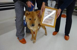 この度、めでたく新しい飼い主さんとめぐり会う事ができ ました。そこで!短い期間ではありましたが、ハピまるの 一員として頑張ってくれた、いんげんの卒業式をしよう! と、また安易な思いつきをしてしまい、絵の得意な職員が 卒業証書を作ってくれました。 親方補佐から、卒業証書の授与です。 |