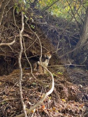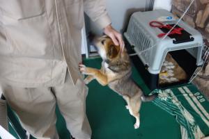 その時は、突然でした。 ちびは逃げ場のない斜面にスーッと入ってくれました。 心の準備をしていないハピまる職員は、逃げ場をふさ ぎしばらくにらめっこ。困った、手の届くところに何もな い!一か八かちびに手を出しました。 やっと、ハピまる職員の思いが届き、片思いは終了? ちびに不安を与えないように、抱えて車に収容。 ほっとしました。 季節も冬間近、雪が降る前になんとか保護できました。 |