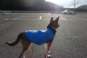 左が事務室内、右が駐車場でのちび。 いろんな人、いろんな音に慣れないと! |