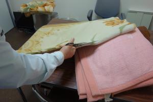 別な部屋では、毛布切りです。 県民のみなさんよりご厚意でいただいたり、私たち県職員 に募って、毎年多くの毛布等が集まります。本当にありがと うございます。 冬期間や小型犬、高齢犬には部屋に毛布を敷いていま す。 「収容中の犬や猫が少しでも暖かく過ごしてくれたらいい なぁ~。」と願いを込めて。 |