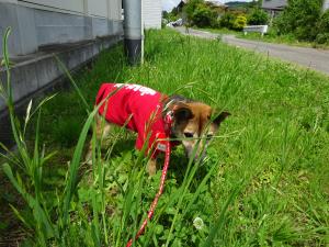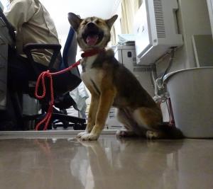 この日、ちびは「小学校への獣医師派遣事業」へ。 いよいよデビュー!。 昨日から、いろいろ心配はしていましたが、とうとうこの 日が来ました。ちゃんと出来るかな?おとなしく待っていら れるかな?車に酔わないかな?こんな事ばかり考えてい ました。 出かける前に、親方と職員のみんなに挨拶です。 親方が電話中でしたので、隣につないでおきました。気 づくと変顔。 その後は、職員に囲まれて激励?を受け。 |