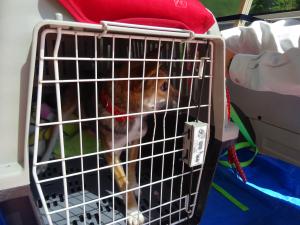 いよいよ、出発です。担当職員に抱っこされ、車に乗せら れました。 不安だったようで、何度もケージから出て必死の抵抗! 最後は半ば強引に、押し込められこの表情です。 不安そうですね~。 ちび、がんばれ!